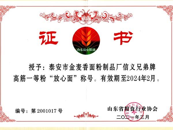 泰安市金麥香面粉有限公司是一家私營(yíng)企業(yè),掌舵人王長(zhǎng)義和總經(jīng)理王長(zhǎng)信兄弟倆人被人們稱(chēng)為信義兄弟,在信義兄弟的堅(jiān)強(qiáng)領(lǐng)導(dǎo)下,在各級(jí)政府的大力支持下,在企業(yè)員工的拼搏下,在客戶(hù)的呵護(hù)下,今天的金麥香欣欣向榮,蒸蒸日上。信義兄弟先后榮獲“泰安市勞動(dòng)模范”、“山東好人”、“山東省道德模范”、“全國(guó)道德模范提名獎(jiǎng)”、“全國(guó)文明家庭”、“全國(guó)十大誠(chéng)信之星”、“全國(guó)優(yōu) 秀農(nóng)民工”等稱(chēng)號(hào)。...